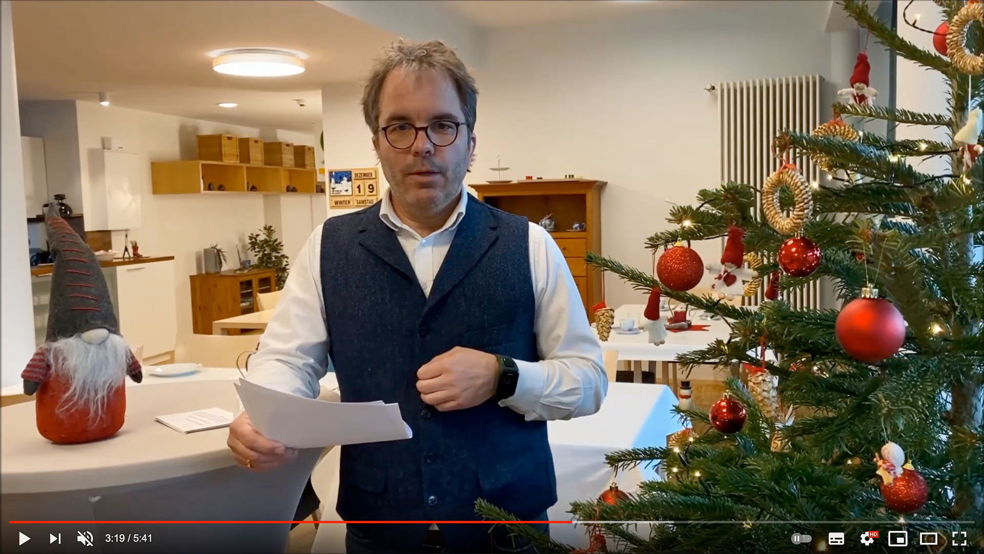 21. Dezember 2020 Weihnachtsansprache 2020 Weihnachtsansprache 2020 von Bernd Meißnest (Vorsitzender Daheim e.V.)Zum Abspielen klicken Sie bitte auf das Bild. (Bitte beachten Sie: Der Film wird in einem neuen YouTube-Fenster geöffnet.) Alle Nachrichten von Daheim e.V. zeigen Alle Berichte über Daheim e.V. in der Presse zeigen
