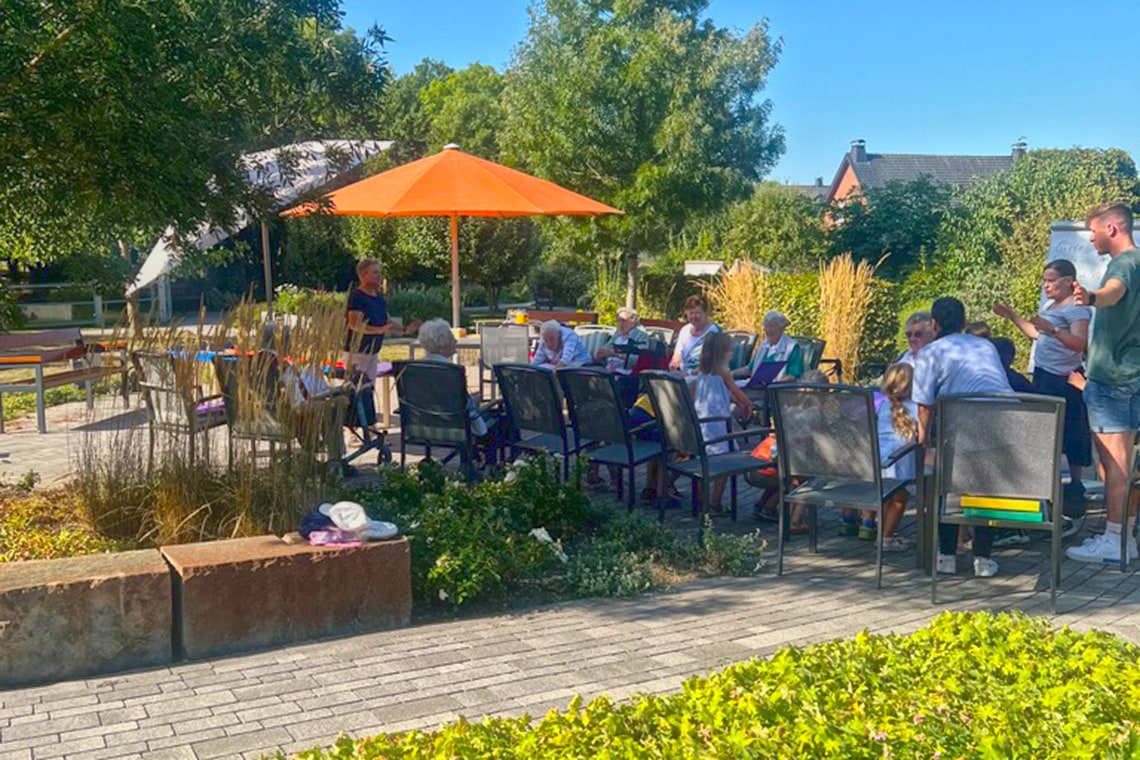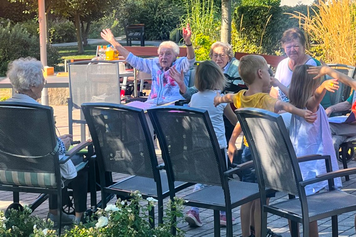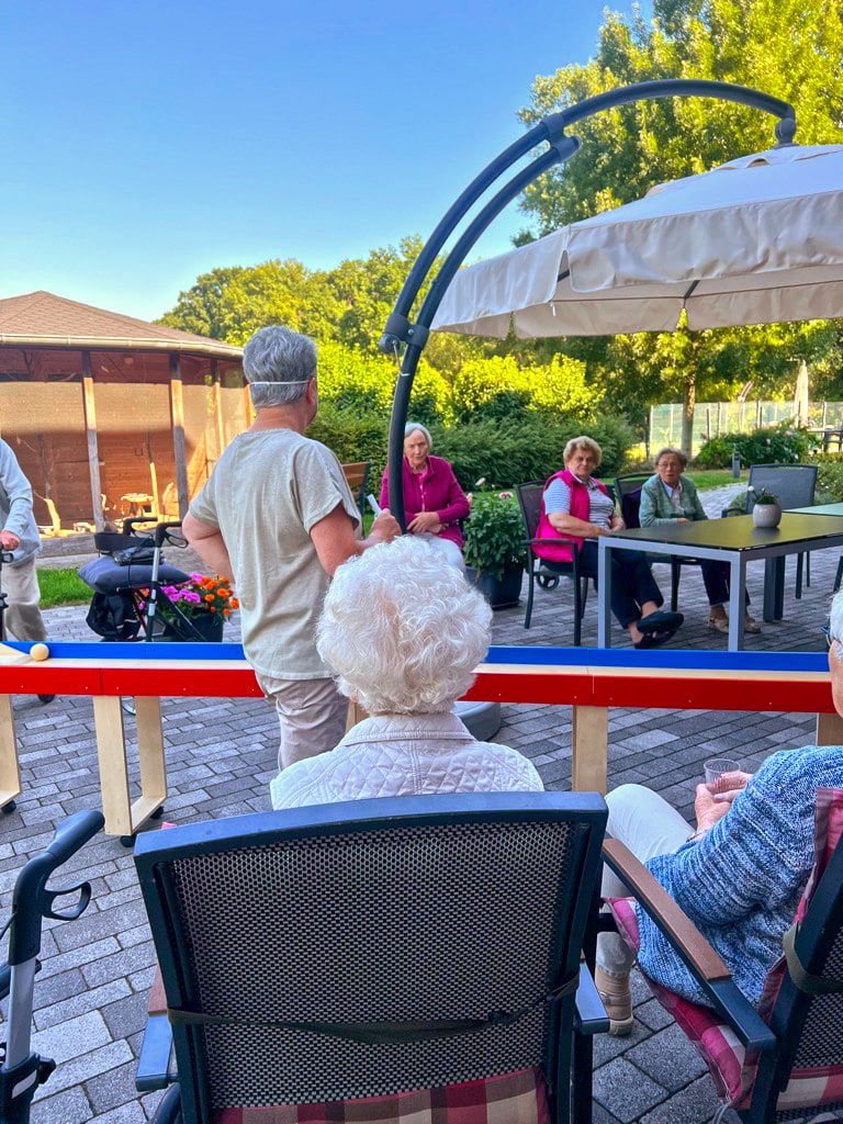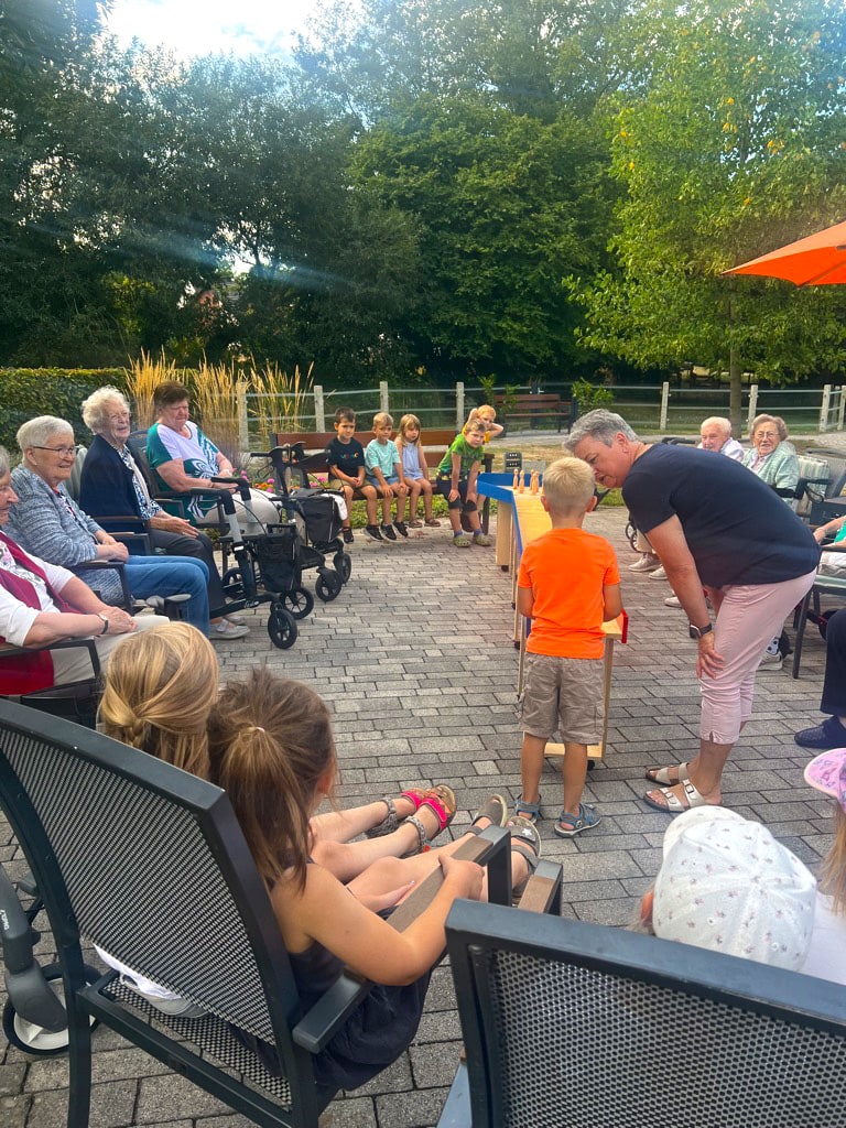 Man trifft sich in gewissen Abständen und verbringt eine kurze gemeinsame (Sommer)Zeit in der Tagespflege. Und weil's da im Garten gerade mal wieder am schönsten ist, ebendort und diesmal zum gemeinsamen Kegeln und Klönen. Jung und Alt genießen diese ungewöhnliche Zusammenführung, denn viele der alten Menschen vermissen den eigenen Familienanhang, ebenso wie einige der Kinder keine/n eigene/n Großmutter oder Großvater mehr haben. Es entstehen hier echte Bindungen, die vor allem die alten Menschen wieder ein wenig zurück in eine lebendige Gemeinschaft bringen, denn Anteilnahme schafft Lebensfreude. Und nach so zwei Stunden mit viel Spaß und lautstarkem Spiel an der Holzkegelbahn geht es für die Kleinen nach Hause und alle freuen sich schon auf das nächste Mal.