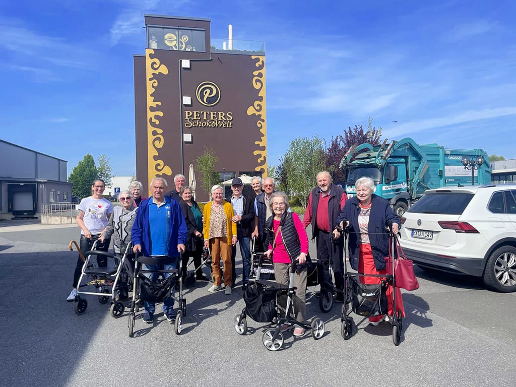 Einen schönen Frühlingsausflug ins Umland mit Besuch der Schokoladenfabrik Peters in Lippstadt brachten unsere Steinhagener mal wieder auf gemeinsame Tour. Hausgemeinschaft und Tagespflege hatten sich erwartungsvoll auf den Weg gemacht und sollten nicht enttäuscht werden.