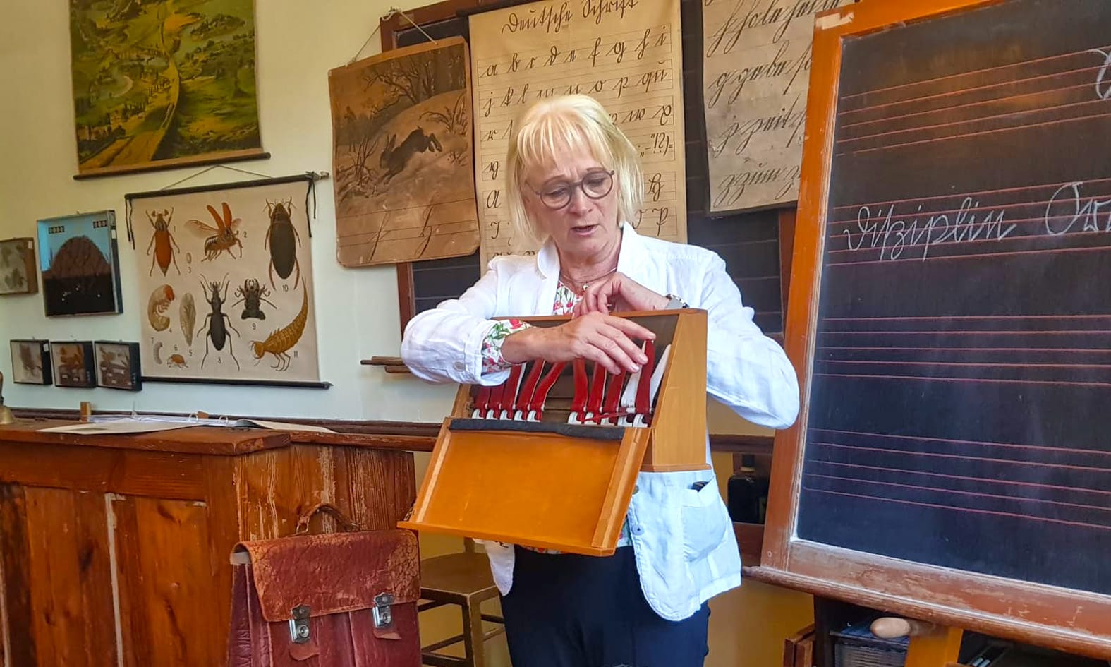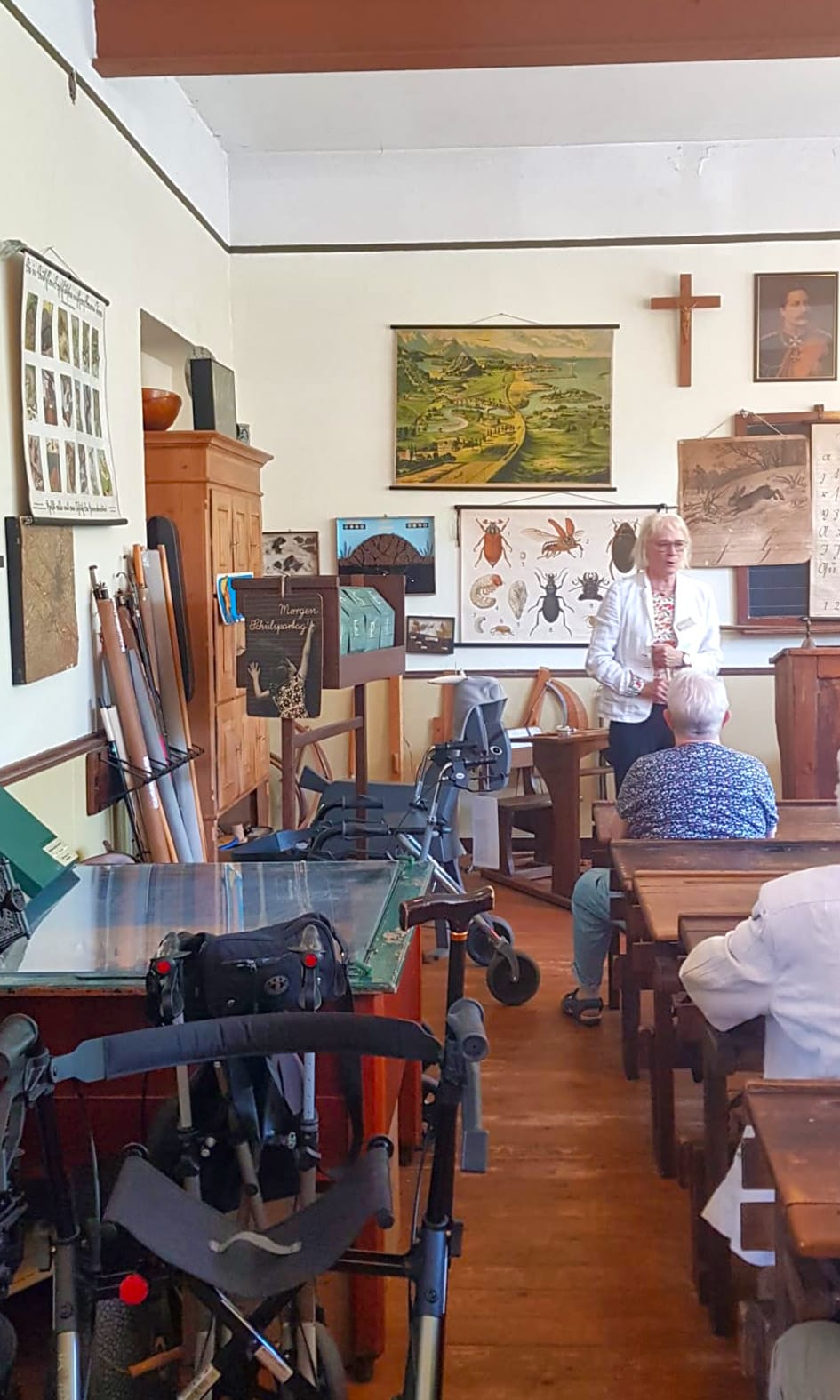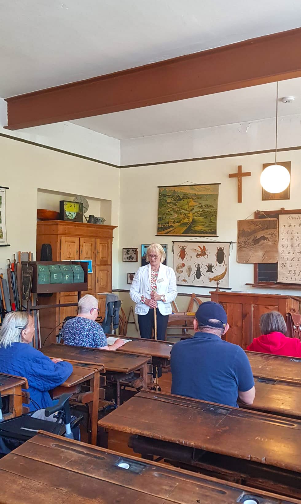 Unsere Gäste bekamen eine gute Führung durch die Schule und erhielten einen Eindruck vom Alltag einer Dorfschule vor gut 100 Jahren. Schule war damals ein Ort strenger Disziplin, Kinder hatten kein Mitspracherecht, körperliche Züchtigung und Strafen noch als Erziehungsmittel die Regel. Alle konnten sich ein eigenes Bild vom Leben in der Schule machen, von der Schulbank üder den Lehrerpult bis zu den Lehrmitteln und Schulrequisiten, etwa der Holzbüchertasche, als eine regionale Besonderheit.