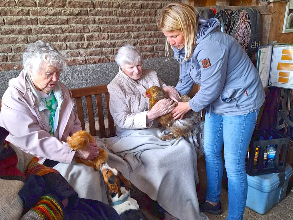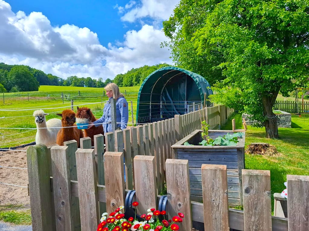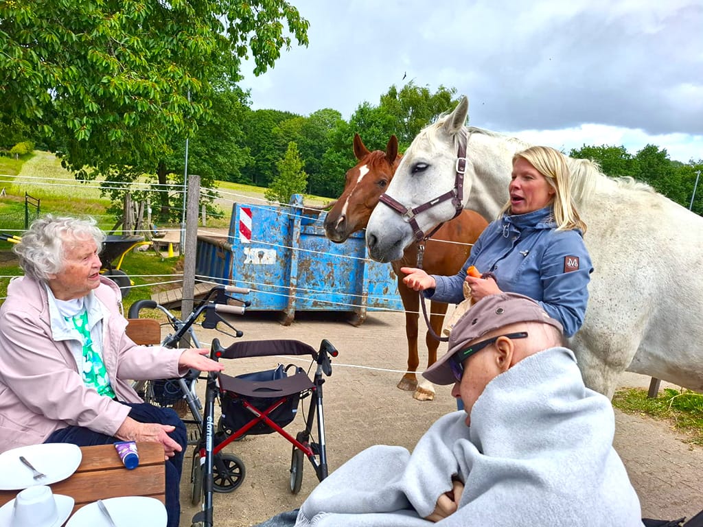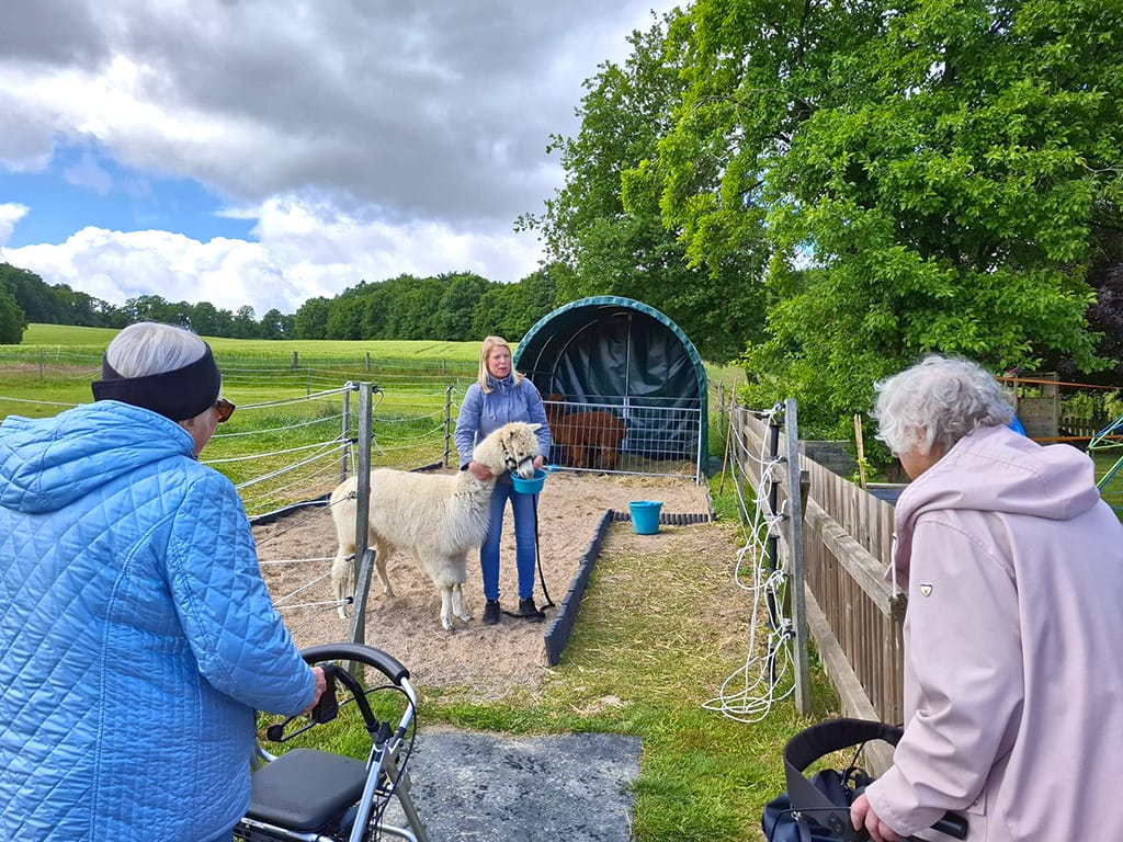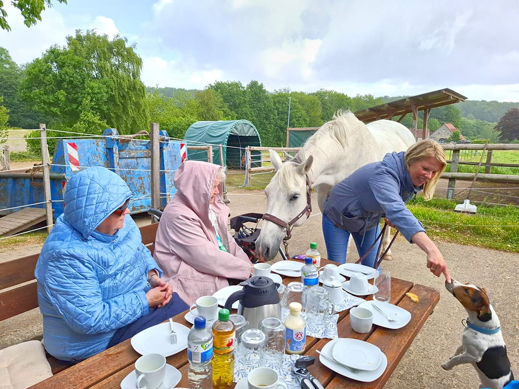 Es ist nun schon ein paar Tage her aber immer noch in schöner Erinnerung unserer Gäste der Tagespflege Werther: der Mai-Ausflug zum Hof Schubert. In schönem ländlichem Umfeld bietet dieser Hof den Gästen eine besondere Erfahrung und Nähe zu den Tieren: insbesondere Alpakas und Pferde aber auch Hunde, Katzen und das liebe Federvieh konnten von den Besucher:innen aus nächster Nähe begutachtet und gern auch gestreichelt und gehalten werden. So konnten bei einigen Gästen schöne alte Erinnerungen an das Landleben mit Tieren wachgerufen werden – was auch manch rührende emotionale Reaktion hervorrief.