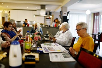 Der Tisch im großen Gemeinschaftsbereich wird bei den Mahlzeiten gern und von vielen Bewohner:innen genutzt. Schon morgens geschieht hier Vieles parallel: frühstücken, klönen, Zeitung lesen (und vorlesen!). So beginnt ein gut gelaunter Start in den Tag.