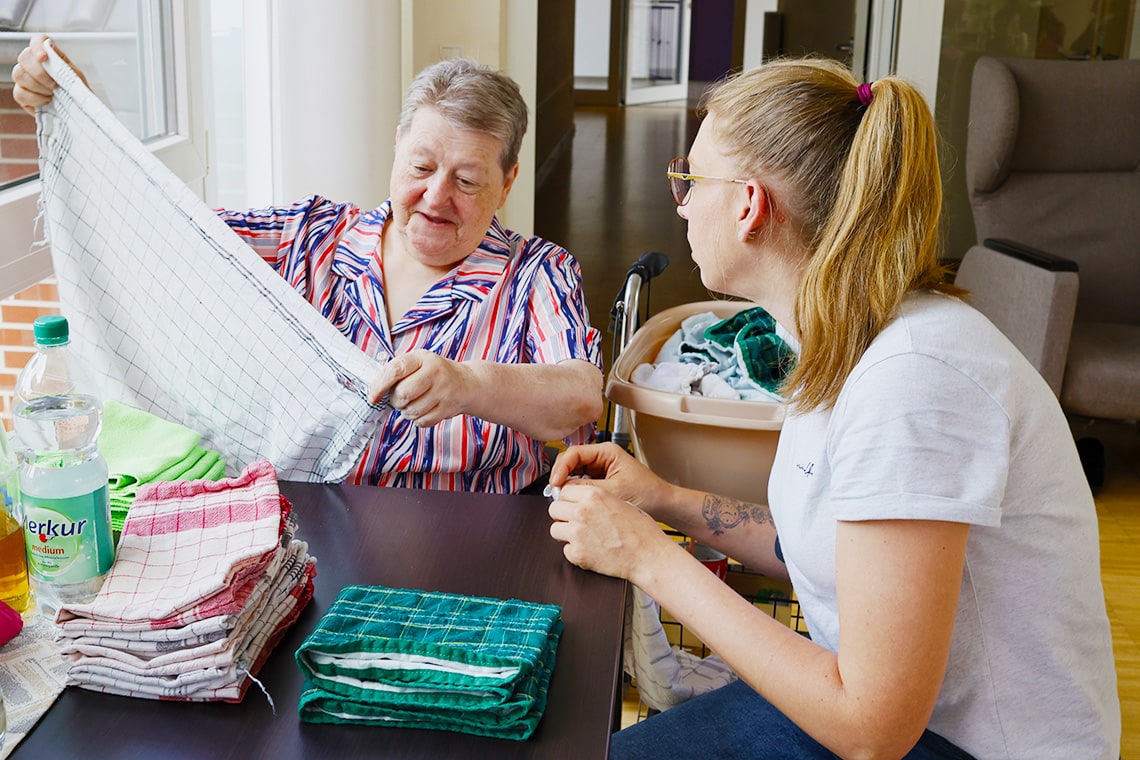 Unsere Mitarbeiter verstehen sich als „Alltagsbegleiter“ und unterstützen jeden Bewohner durch Betreuung, Pflege und bei der hauswirtschaftlichen Versorgung. Auch nachts ist immer ein Ansprechpartner vor Ort.