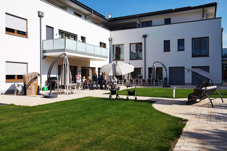 Zum Haus gehört ein Sinnesgarten, der zum Riechen, Fühlen und Schmecken anregt. Die Terrasse lädt zum Verweilen ein. Sei es um mit den anderen Bewohnern ein kleines Schwätzchen zu halten oder um einfach nur die Sonne zu genießen.