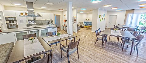Der großzügig gestaltete Wohn- und Eßbereich hinter dem Entrée ist Mittelpunkt der Tagespflege. Es gibt genügend Platz für Spiele und Bewegungsübungen oder auch Gesang und Tanz in netter Runde. Einladend ist es auch weiter hinten in der Sofaecke mit Fernseher und Musikanlage.